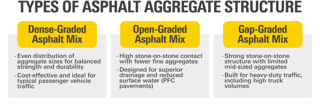 The main component that controls an asphalt mix type is its aggregate structure, which refers to how aggregates, from large to small, are arranged within a mix.