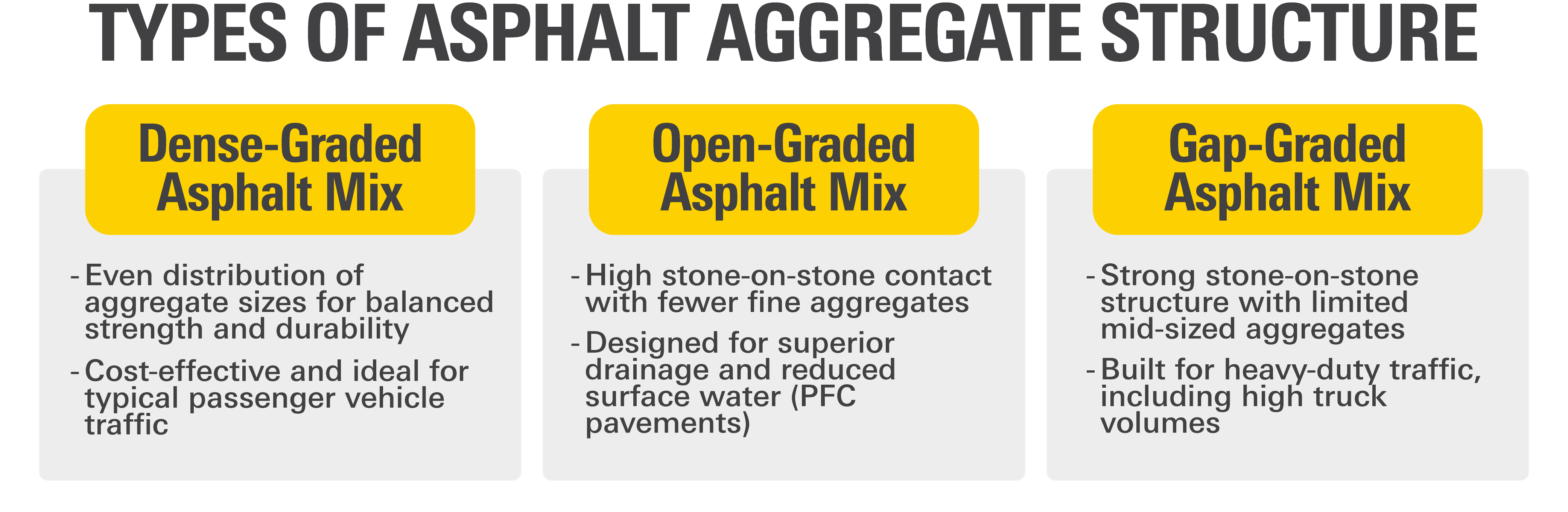 The three main types of aggregate structure in asphalt mixes are dense-graded, open-graded and gap-graded.