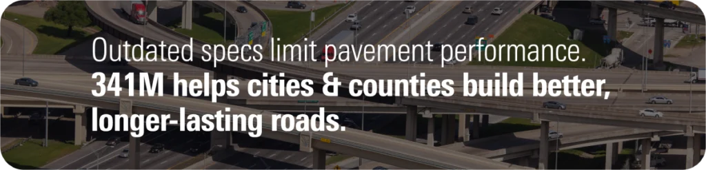TXAPA developed the 341M specification (with “M” standing for “modified”) as a modernized, flexible specification tailored to the unique needs of Texas cities and counties. While it closely aligns with TxDOT standards, 341M recognizes that local agencies often operate with fewer resources and different acceptance criteria than TxDOT.